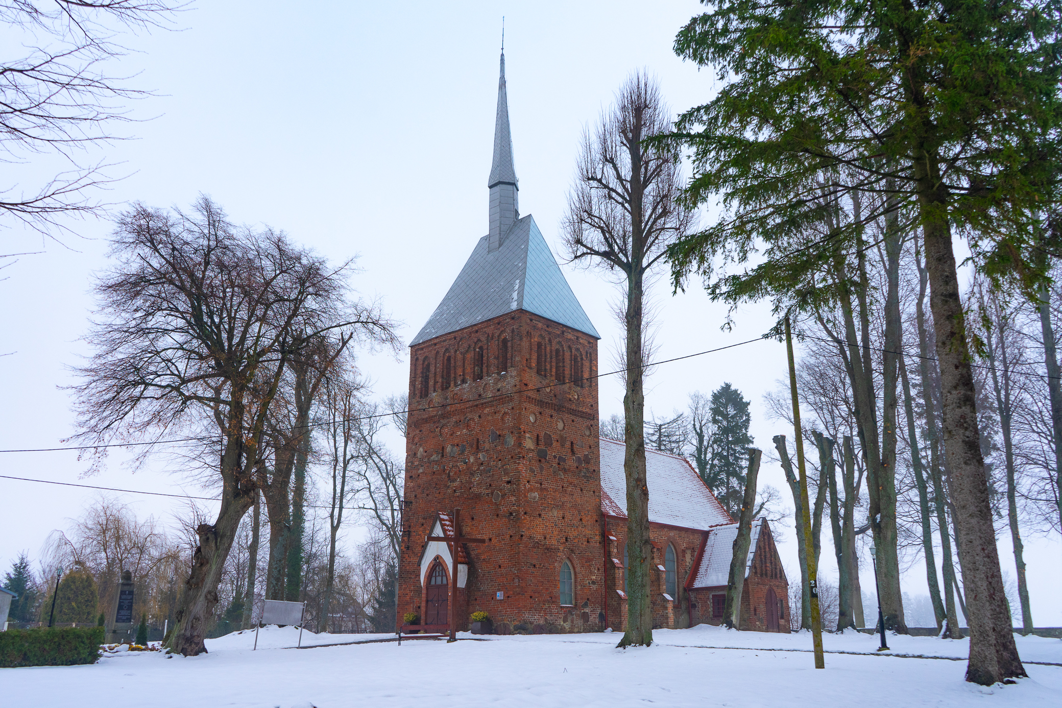 Sporych rozmiarów gotycka świątynia pochodzi z XV w., została wzniesiona z czerwonej cegły i kamieni polnych. Ze względu na swoje położenie na niewielkim wzgórzu zdecydowanie góruje nad wsią. Posadowiona jest na planie prostokąta, od frontu znajduje się kwadratowa wieża z odznaczającą się iglicą. Ciekawostką architektoniczną na skalę całego Pomorza jest okrągła rzeźba słońca z wypukłymi policzkami i włosami imitującymi promienie. Jest ona umieszczona na zachodniej ścianie wieży. W jej zwieńczeniu znajdowały się niegdyś dzwony, które w latach wojennych zostały przeznaczone na cele militarne. W środku można podziwiać kilkumetrową płaskorzeźbę przedstawiającą św. Jerzego zabijającego smoka oraz prospekt organowy z XIX w.